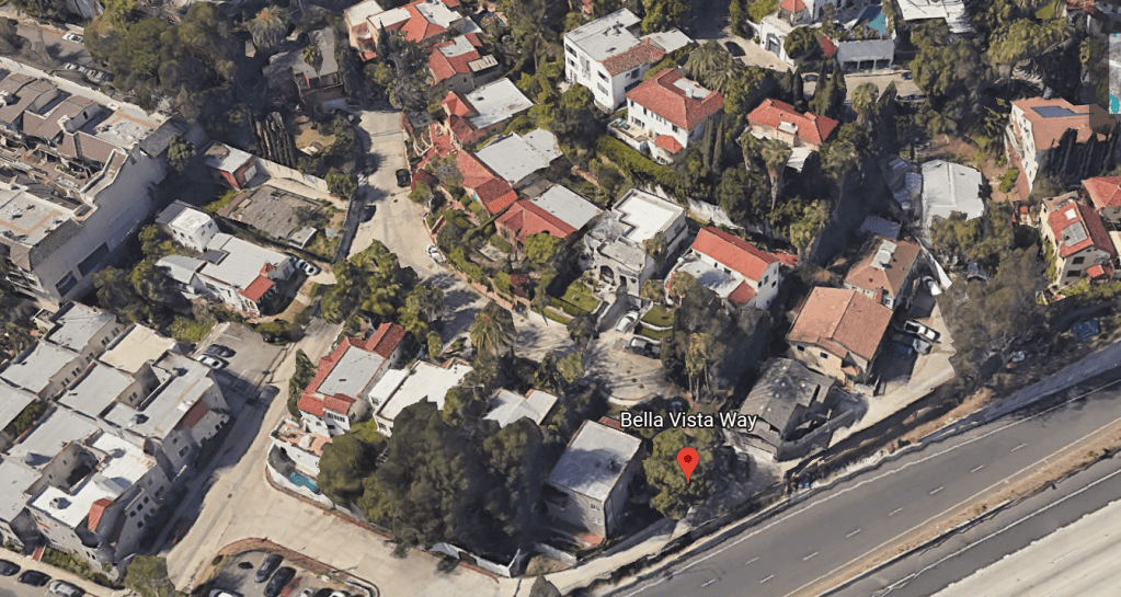 Bella Vista Way was another street that was comprised of many of the earliest houses built beginning in 1915 and encountered that same demise that Fairfield Avenue did. The screenshot below shows what is left of Bella Vista Way. The three properties to the immediate right of the red dot are all that remain.