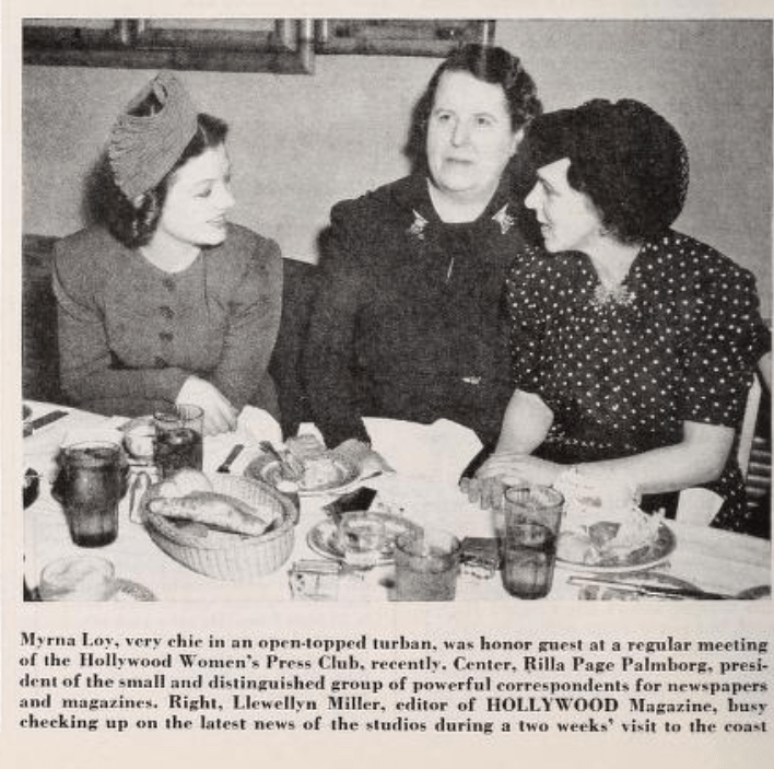 Carl was an insurance salesman and Rilla was an entertainment writer (think National Enquirer). Palmborg was a reporter and wrote many articles about celebrities in magazines such as Movieland, Photoplay, Movie Picture Magazine in the 1930-40’s. Palmborg had interviewed celebrities such as Vincent Price, Hedy Lamarr, Gene Tierney, and Mae Murray. She is seen in the center below with actress, Myrna Loy, to her left.