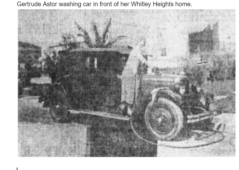 Silent screen actress, Gertrude Astor, purchased the home in 1926 and resided at the property with her mother until 1928 when she moved to Beverly Hills. Astor, who never married or had children, obtained over 340 movie and television show parts from 1915 through 1966. She was the first actress to sign a contract with Universal in 1915 who began her career playing the trombone and saxophone on a riverboat. Below Astor washing her car in front of the home circa 1925; she was dubbed “the Nash girl”.