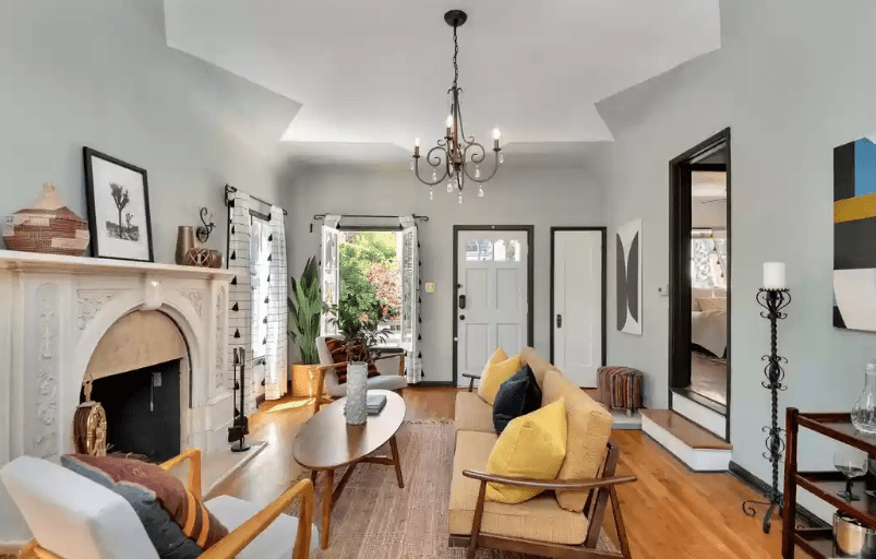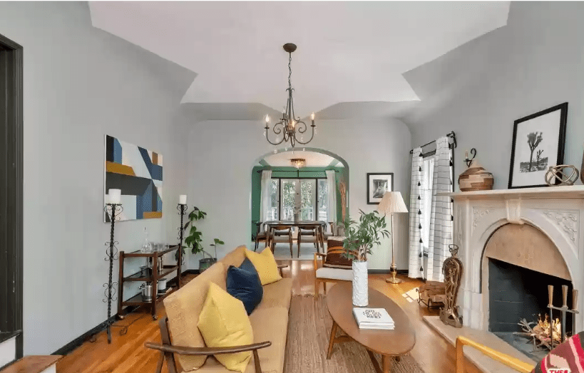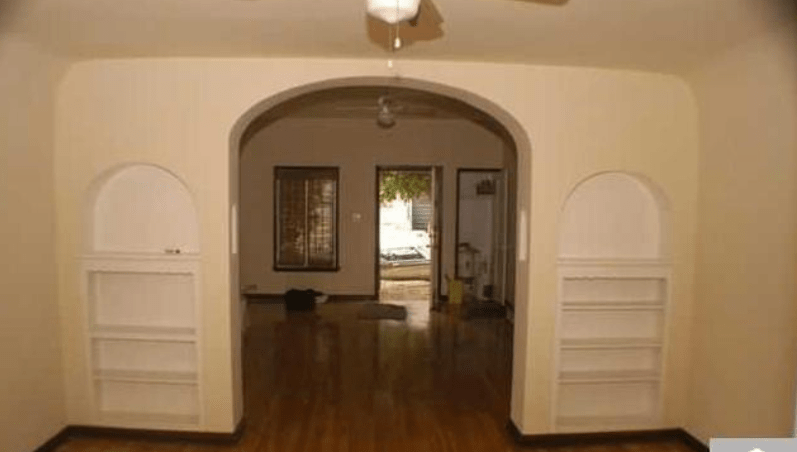 The same year in February, art director, Hector Crowley, was returning to this residence in the middle of the night and observed several rowdy party-goes leaving a residence nearby. The party giver threw the guests out in an aggressive manner and Crowley approached the neighbor out of concern. The host hit Crowley on the head with a dumbbell and was taken to hospital. Police did not find anyone at the residence where the party took place. Poor Mr. Crowley. Below is the living room area upon entry of the front door; the dining room can be seen at the back of the home. The door to the left goes into a bedroom.