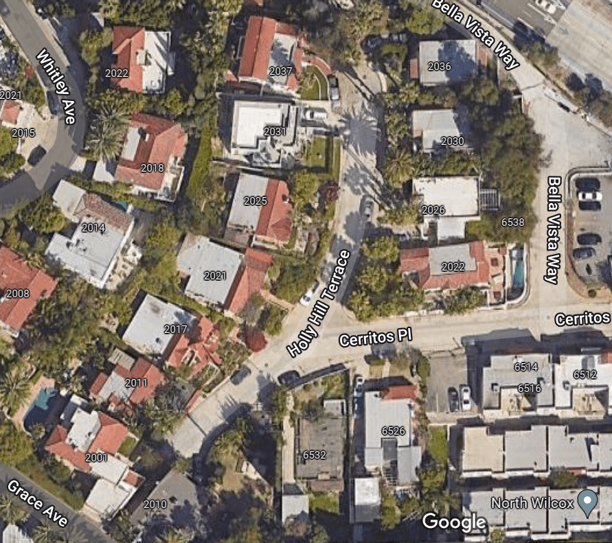 2030 Holly Hill Terrace was one of the earliest homes to be built on the newly developed Holly Hill Tract in 1922. Charles M. Hawks, a former vaudeville actor on the Orpheum Circuit as a monologue entertainer, severed ties with the Whitley Heights organization. He was hired at Fargo Realty, located at 2018 Whitley Terrace to specialize in selling properties on the Holly Hill Tract. Seen below, Holly Hill Terrace, located off Cerritos Place, comprises of twelve residences. Some of the residences house numbers have changed as 2030 Holly Hill Terrace was formerly 2012 Holly Hill Terrace when it was being built in 1922.
