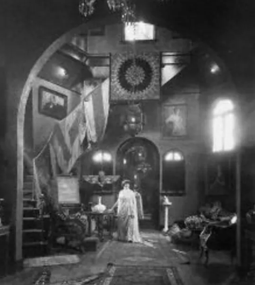 In 1920, British actor Vessey O’Davoren arrived in Los Angeles because the dry climate would be good for his health and he wanted to continue his career in acting. His wife, Mme. Ivy De Verley soon followed him. Ivy was born in Jamaica and moved to London where she opened her own art studio. She was the originator of the “human mask” a new type of art form. The couple stayed at the Hollywood Hotel while they commissioned to build a residence with a guest house on Las Palmas Avenue. In 1921, Ivy opened her own art studio on the property, which comprised of the first floor of the main house. Below, stands Ivy De Verley in the living room surrounded by her art work.