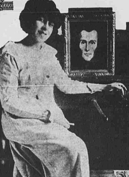 Vessey O’Davoren was a former British soldier who served in the Suffolk Regiment during World War I. Davoren married portrait artist Ivy de Verley on January 15, 1916 in England. He modeled for some of his wife’s masks. According to de Verley, she developed the style after her husband asked her to create his death mask after being told he had a short time to live following exposure to poison gas. However, de Verley outlived his poison gas exposure as he lived to be 100 years old. Below is de Verley posing in front of the portrait of her husband’s death mask.