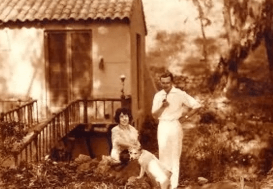 O’Davoren began his acting career on the London stage in 1909. He was then called to serve in World War I for Great Britain. In October 1915, his company was massacred during battle and he was the sole survivor after getting shot and enduring a mustard gas attack. He had lost his voice after the gas attack and was told he had six months to live and should live in a dry climate. He decided to move to California to save his voice and take advantage of the arid climate. He acted in silent films during the seven years it took for his voice to recover from his wartime injury. In 1927, he made his first American film appearance in Arthur Varney’s Winds of the Pampas. During this period he also directed plays including a Hollywood Bowl production of The Pied Piper. O’Davoren was able to transition from silent movies to sound pictures and went on to have a large number of roles. Pictured below is O’Davoren and de Verley in the backyard on Las Palmas Avenue with their dog.