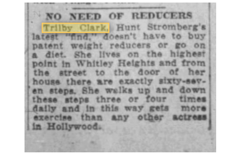While living at this residence, Trilby had filmed two movies: Seventh Bandit and Satin Town. She was mentioned as living at this house in a 1926 newspaper: