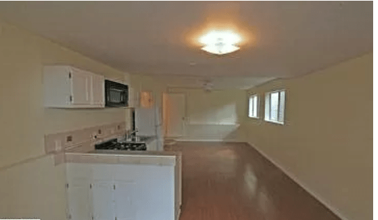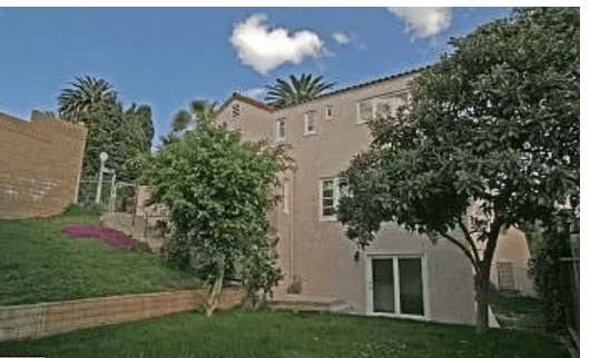 The bonus room has a separate kitchen and bathroom and has been used as a rental unit throughout its history. In 1940, radio singer Jon Conley resided in the apartment and in 1952, voice teacher Neyleen Farrell rented 6636 1/2 Iris Drive. Below is the lower floor of the residence that was often used as 6636 1/2 Iris Drive looking in from the sliding doors seen in the picture above.