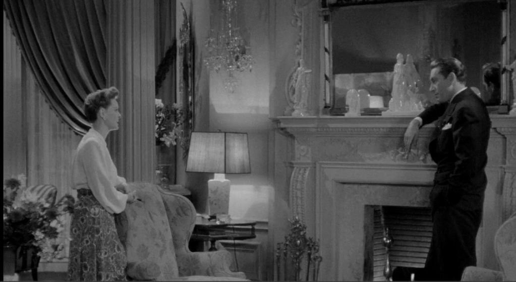 Charlotte learns to be more independent and goes on a cruise, under the advisement of her psychiatrist where she meets a married man played by Paul Henreid. Henreid’s character, Jerry, is unhappily married and has two daughters; the youngest resembling Charlotte. After the cruise, Charlotte and the man part ways but are in love. Jerry, who can’t stop thinking about Charlotte, gets work in Boston and they meet again, this time Charlotte is engaged. Charlotte ends the engagement and her mother dies after they quarrel. Fearing another breakdown, she goes back to the sanitarium and learns that Jerry’s youngest daughter is a patient there. Charlotte takes the daughter home to care for her because it is a way to have contact with Jerry. The movie ends with this arrangement in tact. Below is Bette Davis and Paul Henreid of what looks like the living room of 6621 Whitley Avenue with windows to the left and the fireplace to the right.