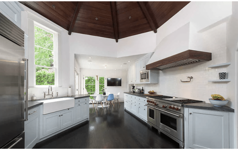 Above is the circular kitchen with the wooden dome ceiling. Below is the living area that is on the floor below and part of the other unit.