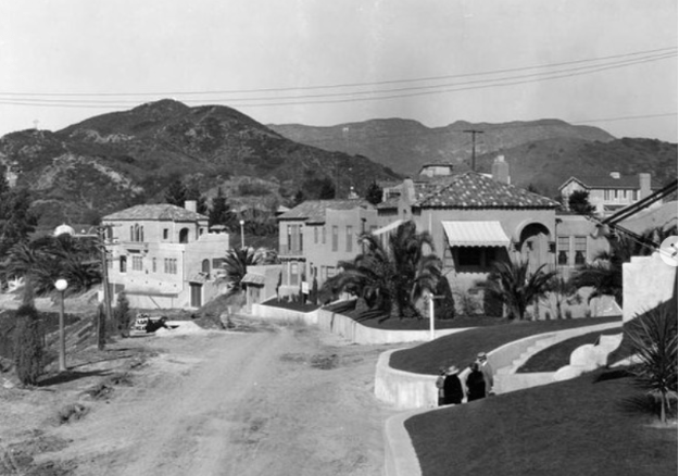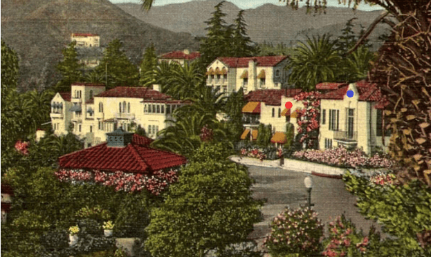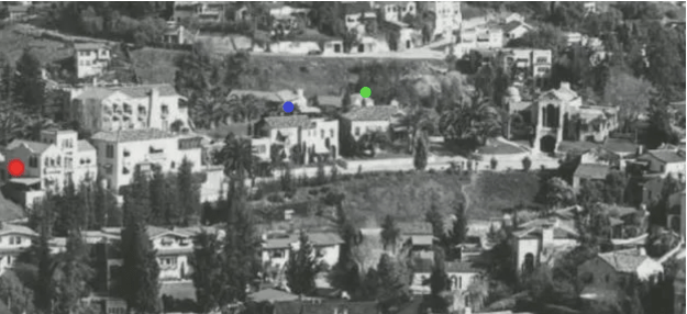 Above, 6793 Whitley Terrace (blue dot) and 6797 Whitley Terrace (red dot) are the two plots of land that the Miller’s purchased and had the two homes built in 1922. The house in the rear is 6809 Iris Circle which exists today. These two homes on Whitley Terrace also had street access on Iris Circle. The house farthest to the left is 6820 Iris Circle (built 1924), once owned by director Carl Leviness and the one to the right of it is a triplex that was built in 1923 and was recently purchased in 2021 and is in the process of being remodeled. (Both of those residences still exist on the Iris Circle side of Whitley Heights. Below, from left to right: 6820 Whitley (red dot), 6814 Whitley, 6797 Whitley (blue dot), and 6793 Whitley Terrace (green dot) in the 1920s.