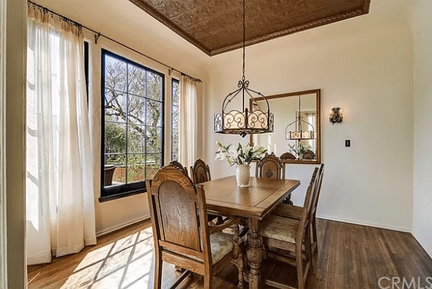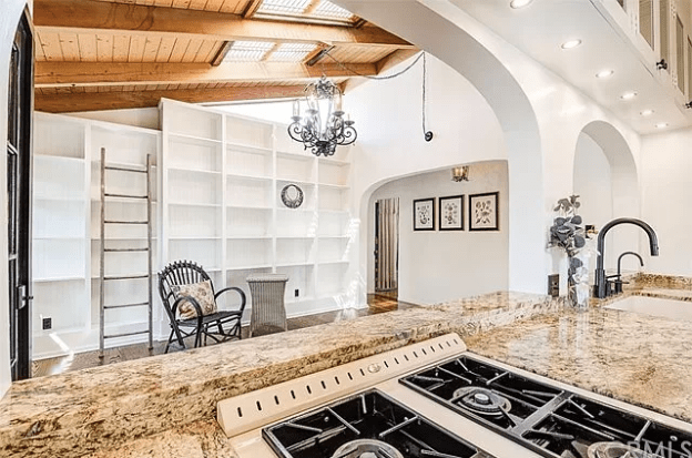 Below, arched doors and walls in the kitchen open up to a family room which has original wooden ceiling with sun windows.