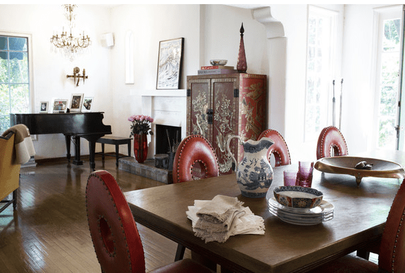 Jacqui, a costume designer and actress, worked on the costumes and wardrobe on Single White Female (1992) and The Godfather Part III (1990). She also had minor acting parts on Jack (1996) and her daughter’s directing debut of Palo Alto in 2013. Jacqui spent time decorating the home and having “hipster” parties that Leonardo DiCaprio and the Olsen twins would attend. She also worked as a stylist at Harper’s Bazaar and as a costume stylist for music videos (Bob Dylan, Beastie Boys, Faith Hill). Below, Jacqui sits on the original staircase of the 1922 house.