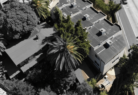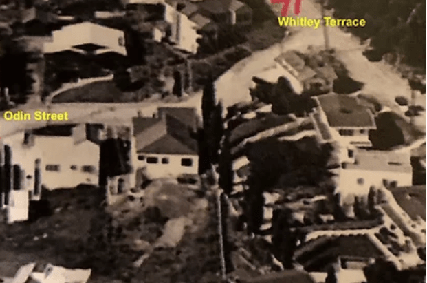 The residence has remained in tact of its original form other than a roof update in 2019. Below is an aerial view of the house in the 1920s before the 101 Freeway was built. 6824 Whitley Terrace is the second house to the left where Whitley Terrace meets Odin Street. The house looks to have a u-shaped driveway on Whitley Terrace. Stairs lead down to a walkway in the rear of the home.