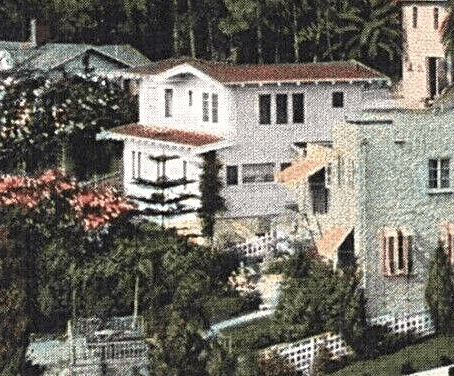 In the 1950s, Gene was part-owner of the Hollywood Stars, a minor league baseball team. In 1960, Gene acquired radio broadcasting rights of a new baseball expansion team and then became the owner of the Los Angeles Angels. In 1966, the team moved to Anaheim and became the California Angels. Gene remained tied to the team until his death in 1983. Presently, the residence if full of overgrown trees that blocks the view of the house on Whitley Terrace. Below is a partial view of the roof on the left, that sits next to condominiums.