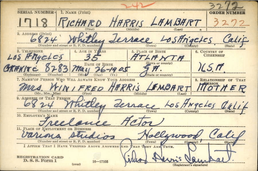 Winifred is listed once again as his son on a 1940 draft card as show below. He also described his job as a “freelance actor” working at “various studios”, a.k.a unemployed actor.
