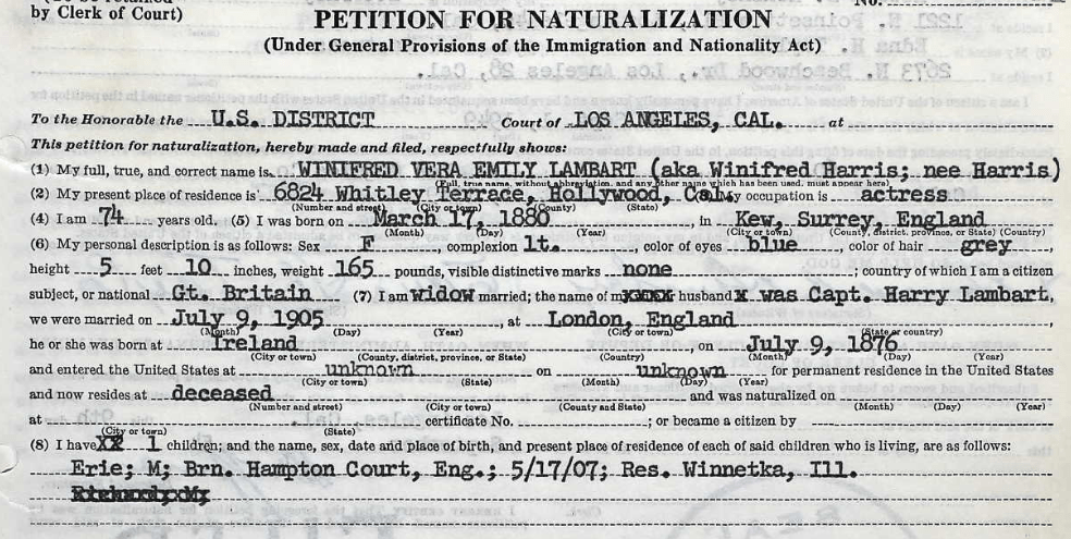 Winifred, pictured above, has been cited as staring in 80 movies, most of which she played non-speaking and uncredited parts. She had such parts in Dr. Jekyll and Mr. Hyde in 1941 and played an uncredited English woman in Casablanca in 1942. What is most interesting is that on a Petition For Naturalization document in 1954 in item #8, she first indicates that she has two children. However, the 2 is crossed out with two x’s and replaced with a 1. Below, her son, Eric is listed as being born in England. Richard is typed underneath, but also typed over with x’s. On a 1940 census, both are listed living at this property and Richard is listed at Winifred’s son and born in Atlanta, Georgia.