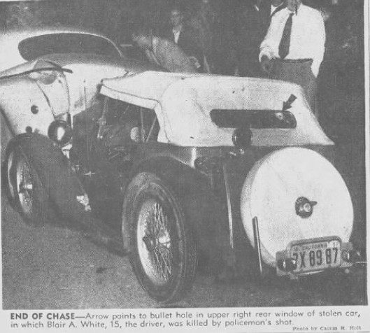 Officer Robert C Maier, who was riding a police motorcycle, motioned for the car to pull over. Instead of stopping, Blair attempted to run over the officer so he shot four times into the vehicle when the roadster spun out of control and hit three parked cars. Blair was shot in the back of the head and died. Dunn, the passenger, was sent to the hospital in critical condition and would survive the accident.