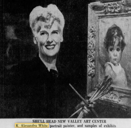 Kay also went into psychology but was also a talented artist. In 1947, Kay Alexandra White established the Eminent Portrait Partners in her home which was to help others who wanted a portrait painted of themselves to be able to find the right artist. She is one of the artists. She had office hours at 6617 Iris Drive and had art showings occasionally.