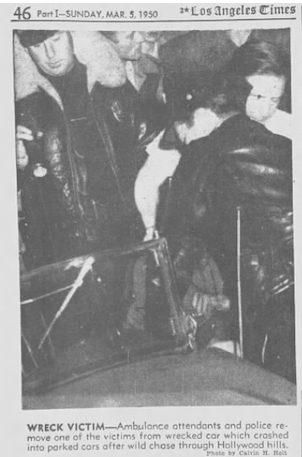 In 1950, tragedy struck the White home. Their 13 year old son, Blair, was shot and killed by a police officer while driving the stolen vehicle. Blair was with 18 year old Wilson Dunn, who was residing at 6766 Wedgewood Place (now torn down for the freeway) when they stole a British made roadster vehicle on Melrose Avenue. The car was registered to Tom Kelley, who happened to be the White’s neighbor and across the street at 6630 Iris Drive. Kelley did not know the vehicle was stolen until the next day. The boys were joy riding the next evening when the police spotted the stolen vehicle on Hollywood Blvd. Blair, who was driving, refused to stop and a high speed chase began through Hollywood Hills with the car sometimes reaching 70 miles per hour.