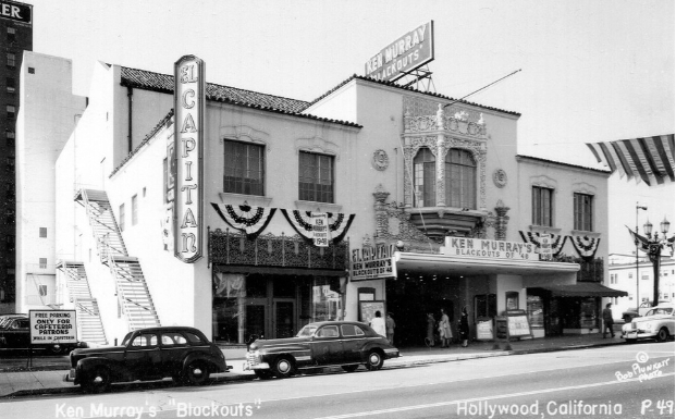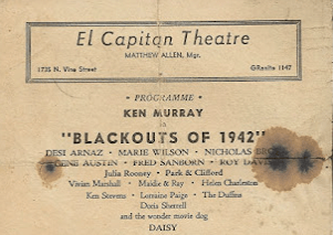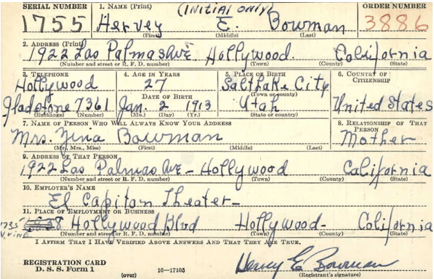 Hervey worked at the later El Captain Theater on Vine Street. That theater was used for a long-running live burlesque variety show called Ken Murray’s Blackouts. CBS Radio also did shows from here including ‘My Favorite Husband’ starring Lucille Ball. Hervey must have made his way up to management because there was an advertisement in the Los Angeles Times in September of 1942 looking for an “usherette” and to see Hervey Bowman for the job. While Hervey was working at the El Captain in the 1940’s the first year of Ken Murray’s Blackouts starred Desi Arnaz. In a 1940 voter’s registration list, Hervey’s occupation was listed as “publicity man”.