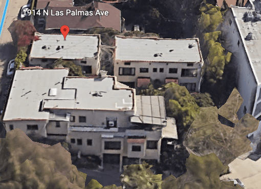 In 1923, Mable was engaged to and married Dr. William Barnhart, a well-known physician in the area. They married at the Ambassador Hotel in June of 1923 and at the same time, Mable was named the general curator of the Women’s Club of Hollywood. Alice died in 1925, but the Barnhart’s continued to live in the complex and grow the number of units, until the mid-1950s when William died. Below, the complex, now known as Las Palmas Gardens Apartments, consists of the two buildings on the lower right. 1914 N. Las Palmas is the original building that the McCormick’s built.