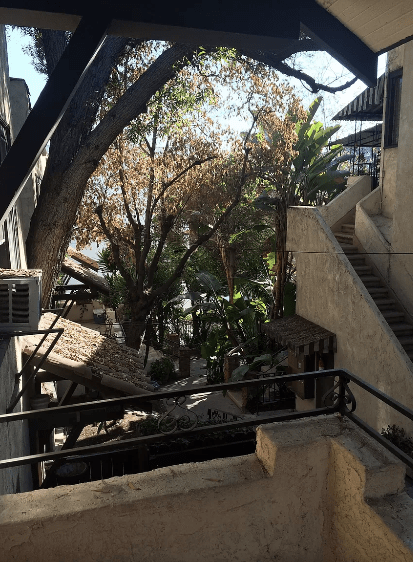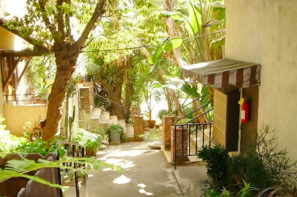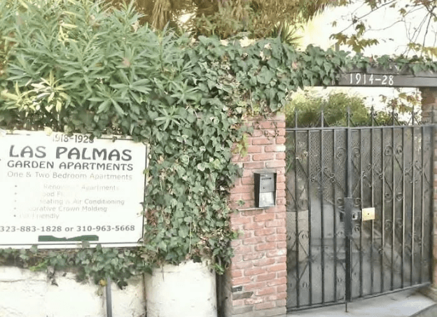 The entrance to the Las Palmas Gardens Apartments is located off the street of Las Palmas Avenue below the first building.