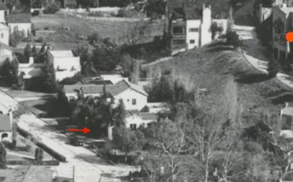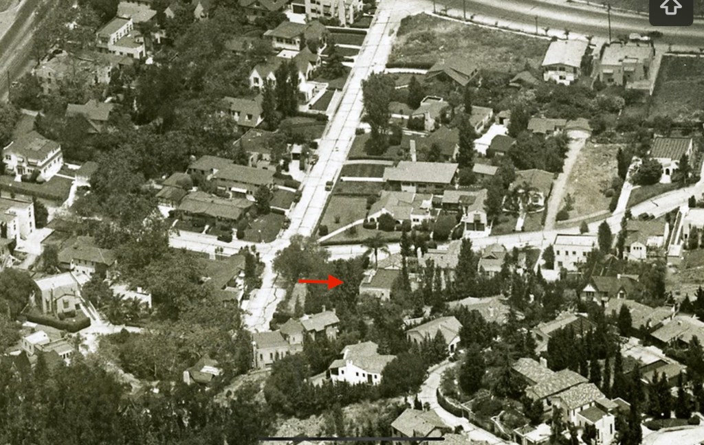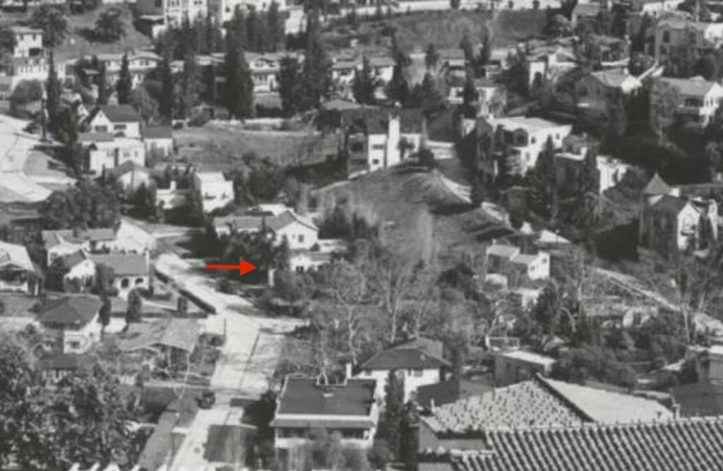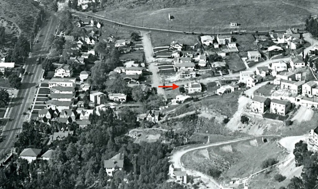 Fortunately, the 1,461 square foot house, that has two bedrooms and one bathroom, was auctioned off and relocated to 11149 Strathern Street in Sun Valley in 1951. Many of the homes in Whitley Heights were built in the 1920s, and some had been relocated but then demolished later since they were no longer part of the historic district. This property, so far, has been spared. The house was originally built in 1921 by George and Belle Perry, who lived in the home with their daughter, Georgia, an elementary school teacher. The Perry’s sold the property after George’s death in the mid-1920s. Below, aerial photos of Odin Street showing the home located at 6644 Odin Street.