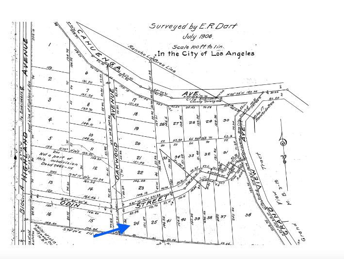 Before Whitley Heights was divided by the 101 Freeway in the 1950s, Odin Street ran west from Whitley Terrace, crossed Highland Avenue and ended in the foothills of Hollywood. A small part of the road that had been left off of Whitley Terrace is now called Lash Lane. There is another part of Odin Street that exists off Cahuenga Terrace which was formerly Fairfield Avenue. The rest of Odin Street was demolished, including lot 24 that was once located on Lockland Place Tract. Below, an early tract map of the area when Whitley Terrace was once called Grand View Avenue and Fairfield Avenue was named Oakwood Avenue when the area first became Whitley Heights.