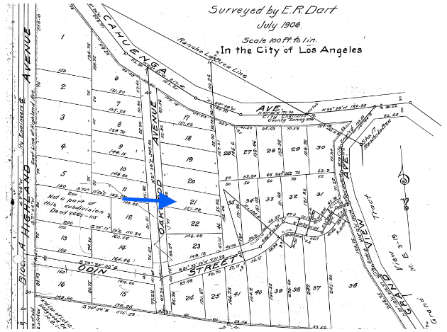 2220 Fairfield Avenue was built in 1923 by architect Kenneth Albright and owner Frank W. Stafford on lot 21 of Lockland Place Tract. The 1,471 square foot home has three bedrooms and one bathroom. In 1949, the house and separate garage were relocated to 2907 Hollister Avenue in the El Sereno neighborhood of Los Angeles and still exist today. Below is Lockland Place Tract map with the location of 2220 Fairfield Avenue on lot 21. The portions Fairfield Avenue was named Oakwood Avenue and Whitley Terrace was named Grand View Avenue in early 1920.