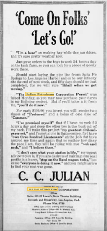In June 1923, he launched the Julian Petroleum Corp., a venture that he claimed would supply standard oil. In less than two months, he sold 5 million worth of stock in his company. He lived large in Los Angeles, went to the best nightclubs with the most beautiful women and even got in a fight with Charlie Chaplin. Eventually his company was investigated for it’s questionable activities and in May 1927, the Los Angeles Stock Exchange stopped selling the stock of the company and all of those invested, including many of the Hollywood elite, lost money. To avoid any consequences, Julian fled California and went to Oklahoma where he was involved in another scam.