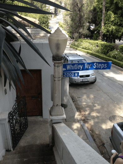 The year that Pointner was living at the Whitley Heights home, his car was found overturned off of Ventura Highway by two people who were traveling to Los Angeles in the early morning of October 3, 1926. They stopped at the new roadster which was unoccupied. When they returned to the crash site later in the morning the car was gone. The only evidence of the crash was blood and broken glass on the ground. After the police were called to the scene, they found a certificate of ownership belonging to Darwin J. Pointner, 2101 Highland Avenue, Los Angeles. Pointner, now a survivor of another horrific crash, shows up in a 1932 LA Directory living at 3901 Glen Feliz Blvd. with a wife named Dorothy. He remained at that address until his death in 1954 and continued to work as a motion picture operator at Fox West Coast Theaters and Loew’s State Theater. Pointner also rented an apartment at 1926 Whitley Avenue in 1924. Below, 2021 Whitley Terrace Steps is pictured in the upper left corner.