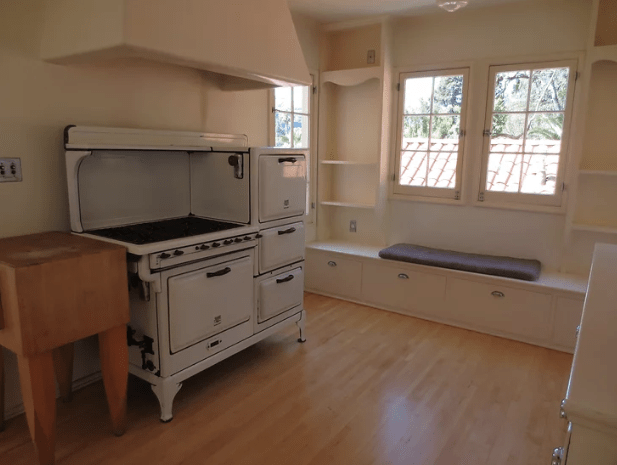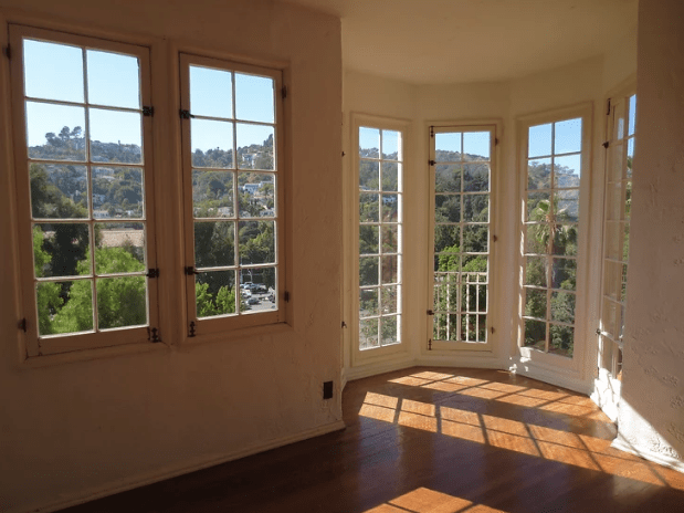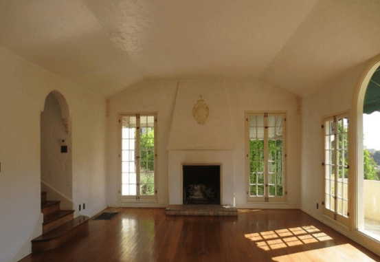 The living room is entered from the front door with its fireplace on the left and a huge way window that faces the Hollywood Hills. The staircase is taken to the two bedrooms and one bathroom on the second floor.
