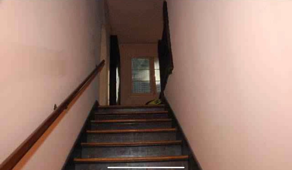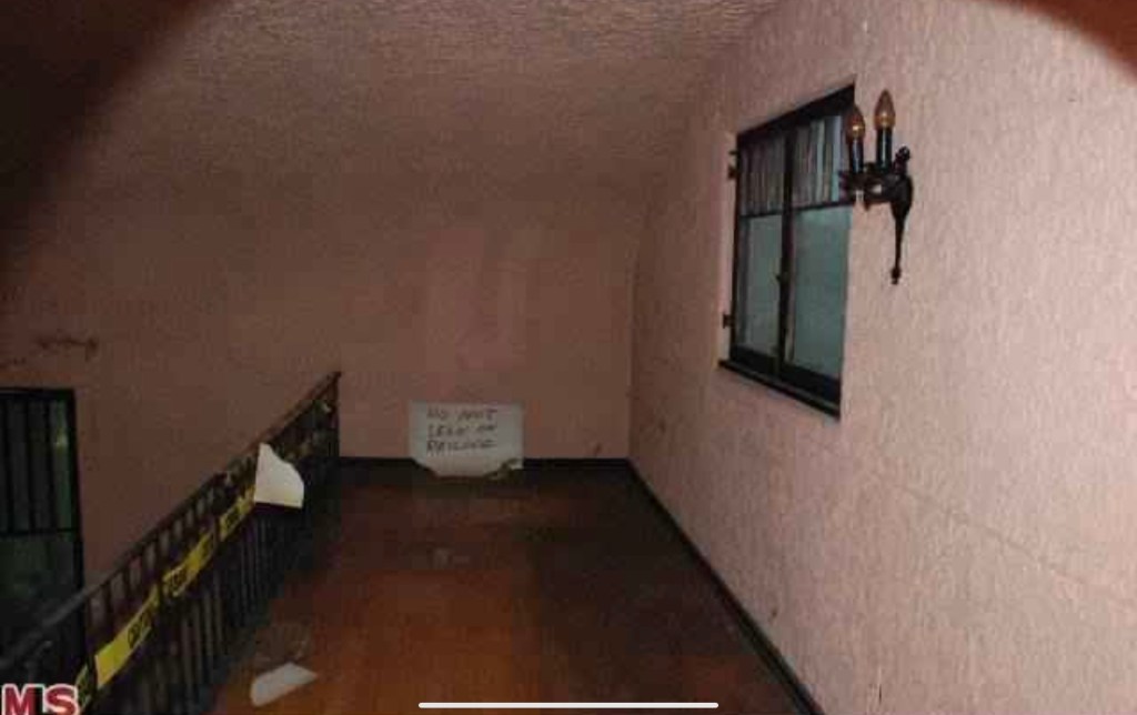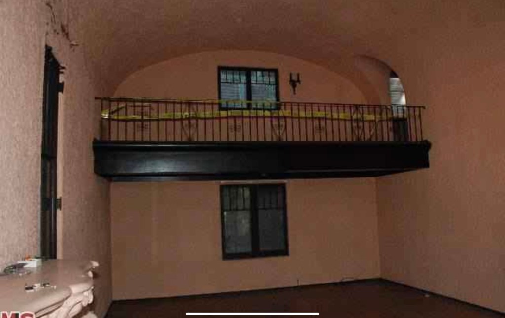 More pink walls that go up the stairway to the second floor. Notice the yellow tape on the balcony and the sign that says, “Do not lean on railing”.