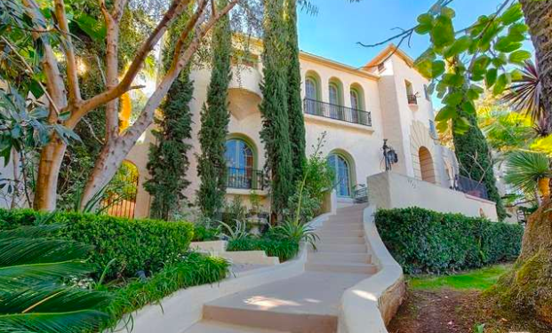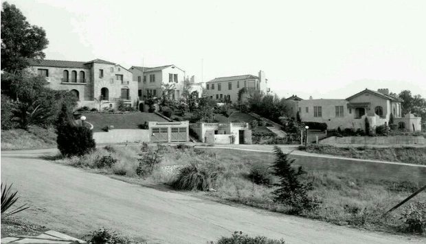 6717 Whitley Terrace (Los Balcones) was built in 1923 by owner and contractor M.C. Kersh. The Mediterranean style home has a Spanish tile roof, arched French windows and doors with balconettes, and two convex balconies. The three story, 2,705 square foot home has four bedrooms and three and one-half bathrooms. There is a one bedroom apartment in the basement. The home has a detached two car garage on Whitley Terrace. Below, 6717 Whitley Terrace is on the right and photographed in the mid 1920s.