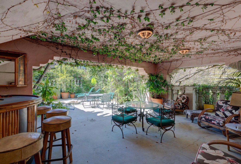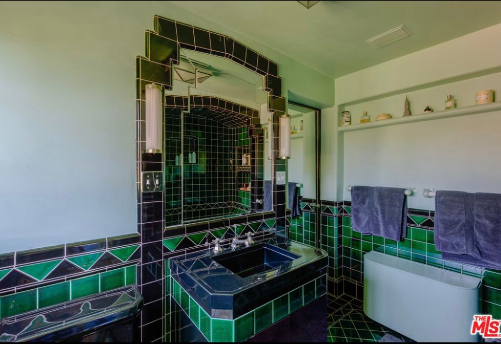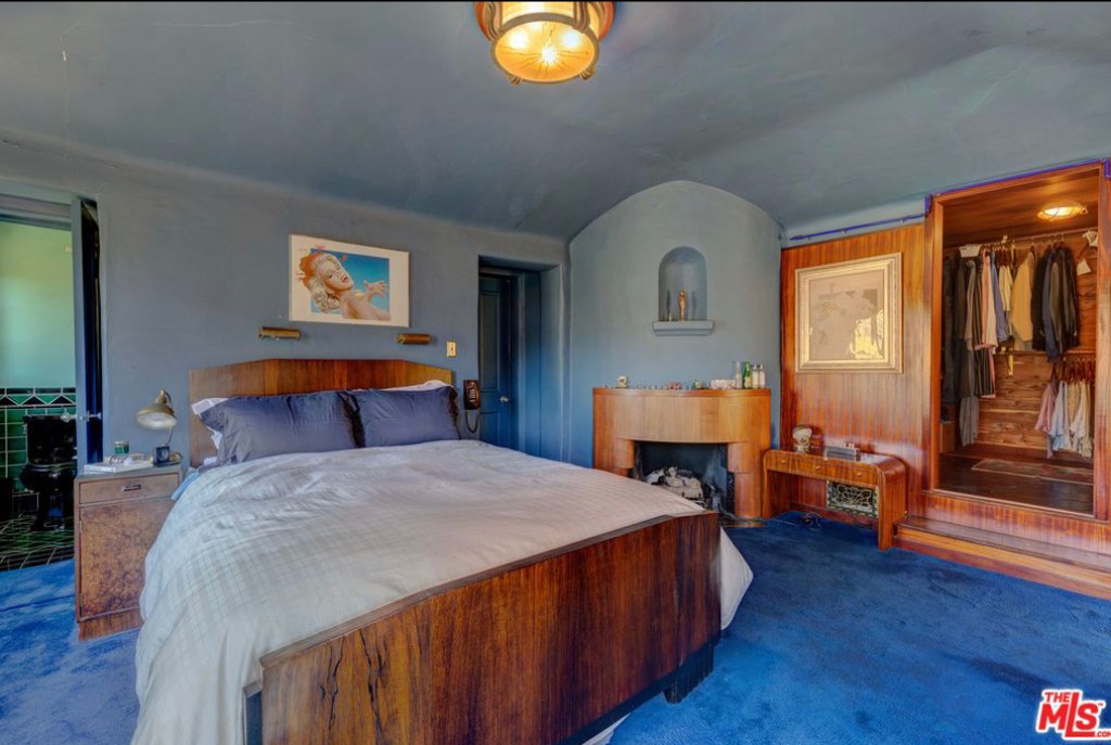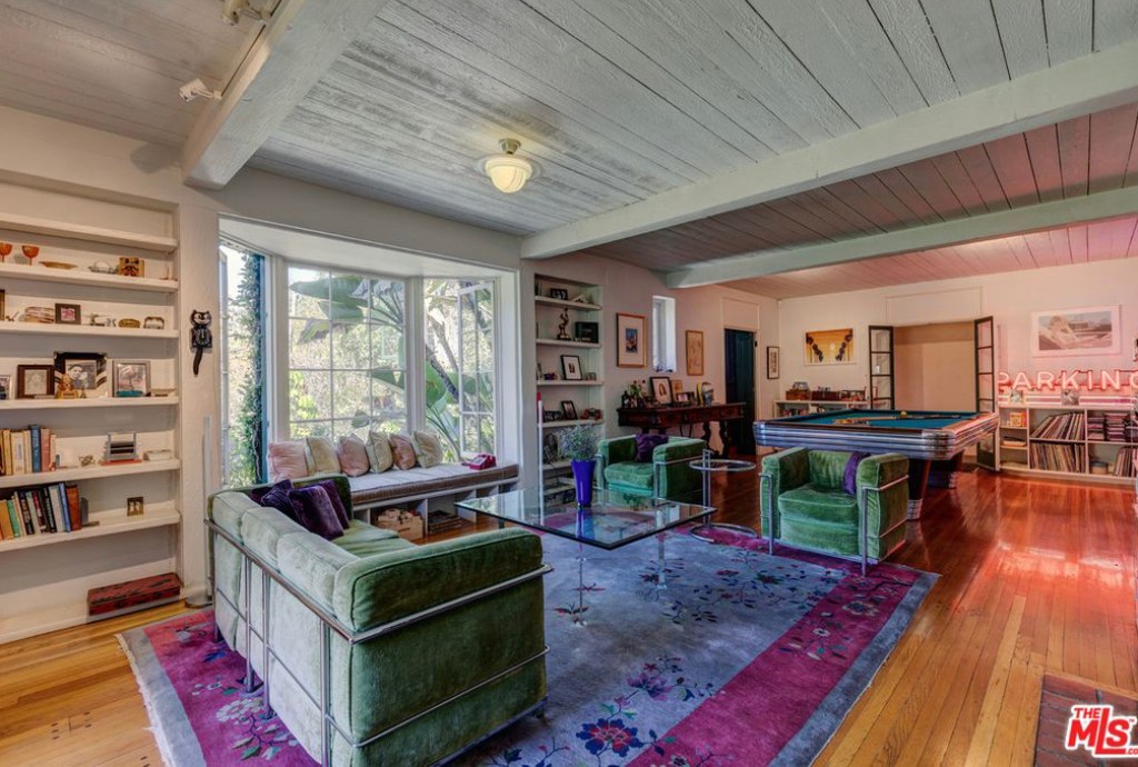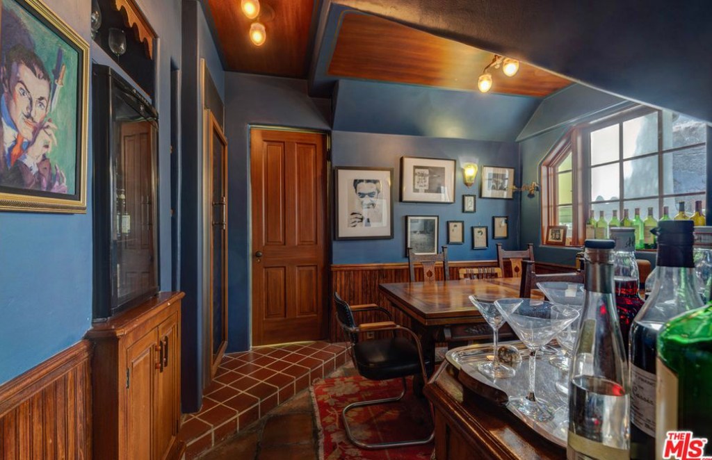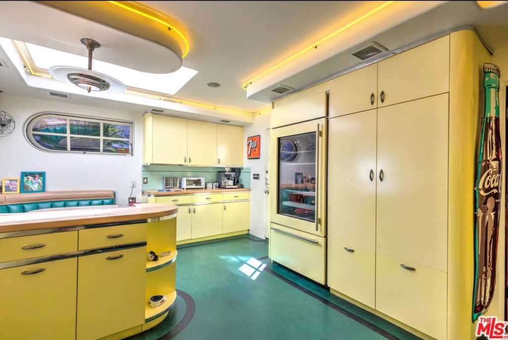 In the 1980’s screenwriter and producer, Roman Coppola purchased the property and now rents out the home. The photographs are currently how the home is furnished when the home is rented out. Coppola has added a unique style to the home, with a laundry room that has been converted into a speakeasy, a vintage arcade table, a wood-paneled den with an upright piano and pinball machine, and a kitchen with a 1940’s Streamline Moderne diner look with curvilinear, metal trimmed butter yellow cabinets and strips of neon along the ceiling. The master suite is reminiscent of a luxurious 1930’s ocean liner with a fireplace set into a curved wall, a cedar lined walk-in closet, a vintage tiled bathroom, and a small adjoining room that can be used as a reading room or nursery.