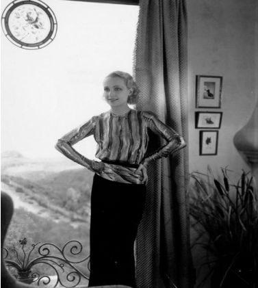 Carole Lombard (born Jane Alice Peters) was born by a wealthy family, but raised in Los Angeles by her mother after her parents divorced. Lombard started her acting career at the age of 12 and was eager to continue acting; she signed a contract with Fox at the age of 16. However, her career almost ended right before her 19th birthday when a shattered car window from an accident left a scar on her face. Makeup to cover the scar helped her to overcome this obstacle and she appeared on 15 short comedies with Mack Sennett Productions. In 1930, she signed with Paramount Pictures who began casting her in dramas. In 1932, Lombard starred in “No Man of Her Own” with Clark Gable and in 1936 she paired once again with William Powell and filmed “My Man Godfrey” in which she was nominated for best actress. Below is Lombard in the Iris Circle living room circa 1931.