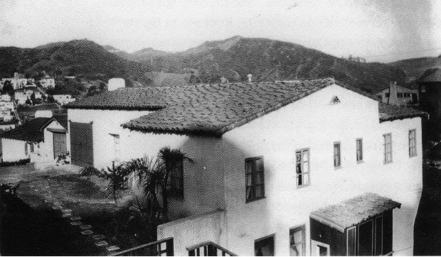 As chief designer for the Walt Disney Studios in Burbank in 1939, Kem Weber also designed the specialized animation furniture that went into the then new studio complex. The Disney animation furniture was designed for specific animation purposes with input from the artists who would be using it. It was all part of Walt Disney’s desire to create an utopian workplace for animated film production. Below the rear of the property can be seen with a partially obstructed view from a tree.