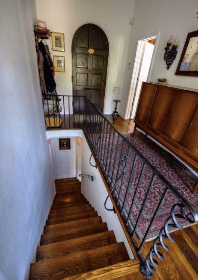 While working for Barker Brothers, he was able to study abroad in Europe, specifically Spain and France, where he brought back the idea to trend more to modern style furniture. The outbreak of World War II curtailed Weber’s design work. He tried to interest the government in a panelized construction system he had invented for defense-related housing projects, but could not secure a contract. After the war he moved back to Santa Barbara and worked mostly as an architect, building a handful of houses there and in nearby Montecito. By the late 1950s, his health began to fail and he died in 1963. Below the front door is on the upper floor which the stairs leading down to the main living area.