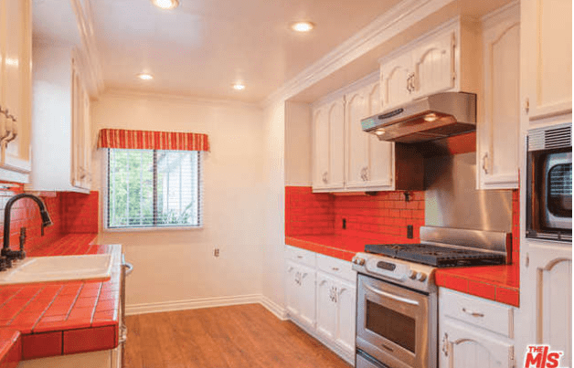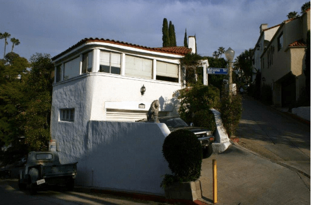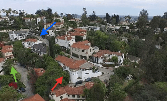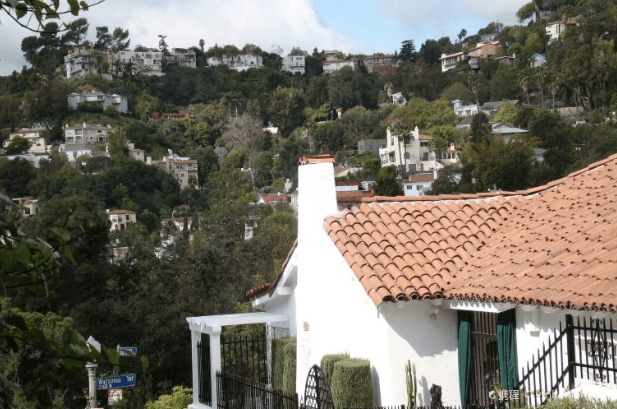Perched on the corner of Milner Road and Watsonia Terrace, 6727 Milner Road was built in 1924 by architect Kem Weber. Weber built two other homes in the area: 6707 Milner Road (1925) and 2062 Watsonia Terrace (1926). Below, the three properties are in walking distance of one another-6727 Milner (red arrow), 6707 Milner (blue arrow), and 2062 Watsonia Terrace (green arrow).