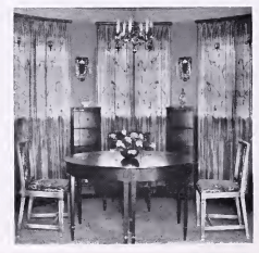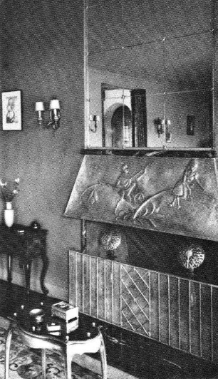 Everything about the dining room is as charming as it is unusual-the roundness of the room-its position, two steps above the level of the long living room-and the specially designed furniture, there being three pairs of chairs, two modern chests in vermillion lacquer, and the color scheme of mist green, silver and crystal. It is softly brilliant and harmonious. The original chandelier hangs below.