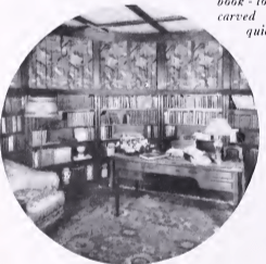 The library is a round room and is directly below the dining room in the “tower”. The Pumphrey’s used rich, dull reds and browns-walnut paneling. A Turkish rug, hand blocked linen hangings a “glowing colors of the book bindings create an appropriate atmosphere for the book lover. The hand carved walnut desk as quiet distinction.