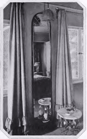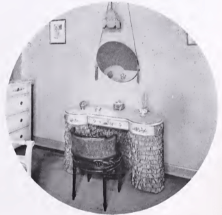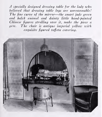 Subtle, restful colors make this boudoir a “self-toned” room, as the decorator calls it. Oyster white carpet, specially woven-wild dove grays and silvers and delicate old rose of hangings and accessories are highlighted with brighter colors of individual pieces. The little onyx makeup table has a silver vase and a rose light bulb under the top sets it beautifully aglow.