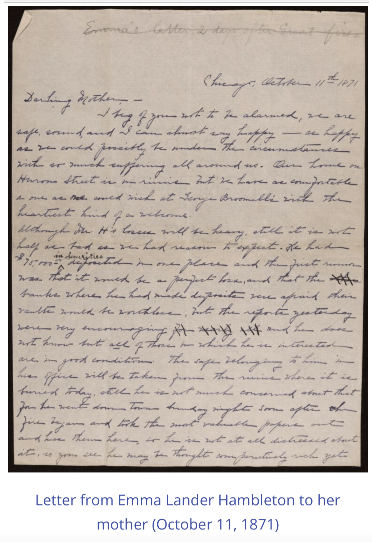 Emma Linder Hambleton was born in October 30, 1846 in Wisconsin and when she was about to turn 18 years old, she married 39 year old Chalkley Hambleton of Chicago, Illinois. They married in Beaver Dam, Wisconsin on on October 7, 1868. Chalkley had his law degree but never practiced as he made his money in real estate and Emma kept the house, but paid attention to her husband’s business which would prove valuable to her after his death. The Hambleton’s had four children: Earl (who was born less than a year after they were married), Maud (born 1873), Clara (born 1878), and Chalkley Jr. (born 1882). The family resided in Chicago and lived through the Great Chicago Fire in 1871. Emma was quoted in several historical accounts of witnessing the fire, including a letter that she wrote to her mother indicating that the family was safe although their home on Huron Street was in ruins: