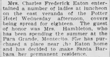 On June, 27, 1900 tragedy struck the family when their eldest son, Earl, died from falling off of a horse while he was riding near his summer home just outside of Chicago. He left a wife and three daughters. A few months later in November, Chalkley died at the age of 71 leaving Emma a widow at the age of 50. In 1903, her daughter, Maud became engaged and married in Santa Barbara in a cottage that Emma had rented. Morning Press (11/2/1913):
