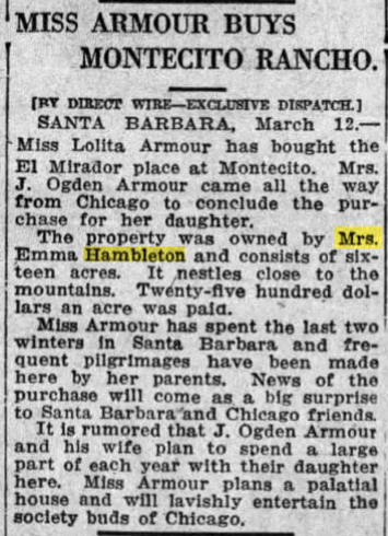 Emma wanted to develop her coastal property in Montecito into a development called El Mirador, but in 1916, she got a good offer to sell that piece of land and made a lot of money.