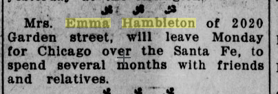 Emma was buying property in Southern California and decided to relocate there full time. Between 1912-1913, she was listed as living at 2020 Garden Avenue and a year later living near a cliff on Coast Highway in Montecito which she purchased in 1906 according to the Los Angeles Times (8/12/1906):