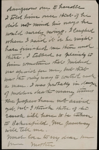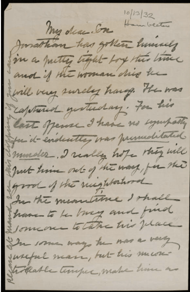 Emma’s ranch hand, Jonathan Stines, looked out for Emma, but could not stay out of trouble. In 1927, Jonathan caught his friend of 20 years, stealing food from Emma’s ranch and went after him. Emma and her servants happened to be at the ranch and witnessed the nearly 3 hour fight in which Alonzo Seaman died from exhaustion. Stines was arrested but later released as the coroner ruled it an accidental death. Then in 1932, he got into another feud with Mr. and Mrs. George Dooley and shot them. Stines fled the scene of the crime and was found 80 miles away. Below is a letter dated October 13, 1932, Emma wrote to her son about the 1932 incident and the newspaper clipping that she sent to her son.