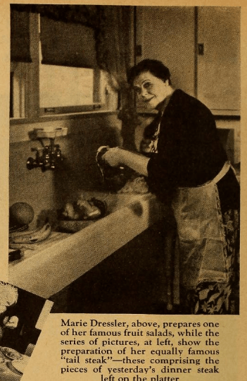 Between 1927-1933 when Dressler was residing in Los Angeles, she starred in 25 roles as she was working hard and her health began to decline. Her doctor suggested she move into a home that did not have so many stairs and levels. In 1930, Marie then rented a home in Beverly Hills (1931 Bedford Drive) and finally was able to purchase her own home in 1932 at 801 Alpine Drive in Beverly Hills. Stricken with cancer, Marie retired in Santa Barbara where she died in 1934. During her career, Marie work with many notables including Lionel Barrymore in Christopher Bean (1933), John Barrymore and Jean Harlow in Dinner at Eight (1933), Wallace Beery and Robert Young in Tugboat Annie (1933), and Norma Shearer in Let Us Be Gay (1930). Below is Dressler cooking in her kitchen in one of the rented homes, possibly the Milner Road residence. Again, Dressler may have temporarily stayed prior to buying her Beverly Hills home in 1932.