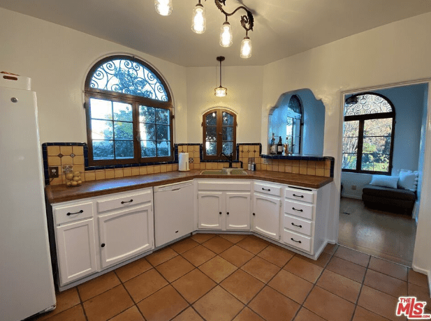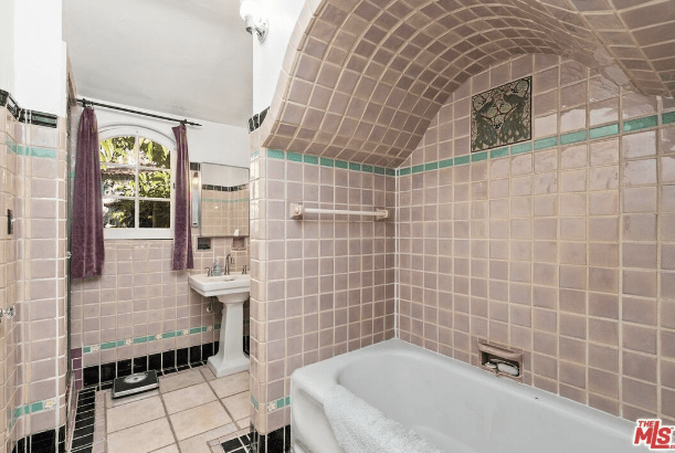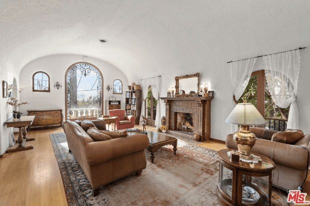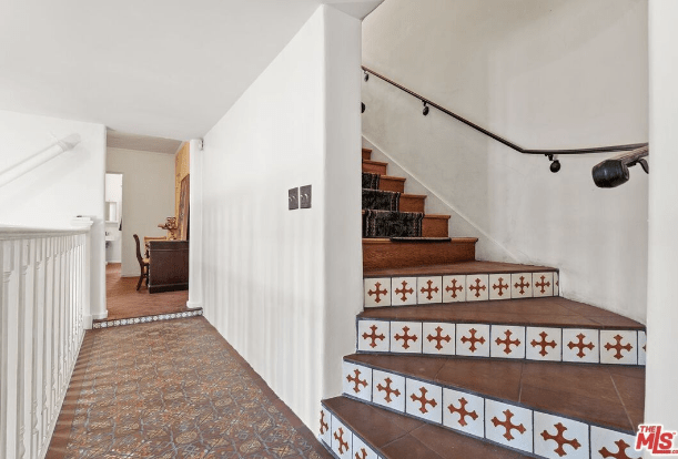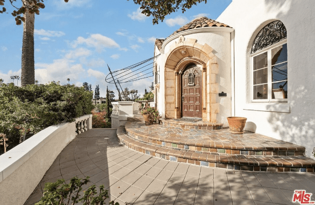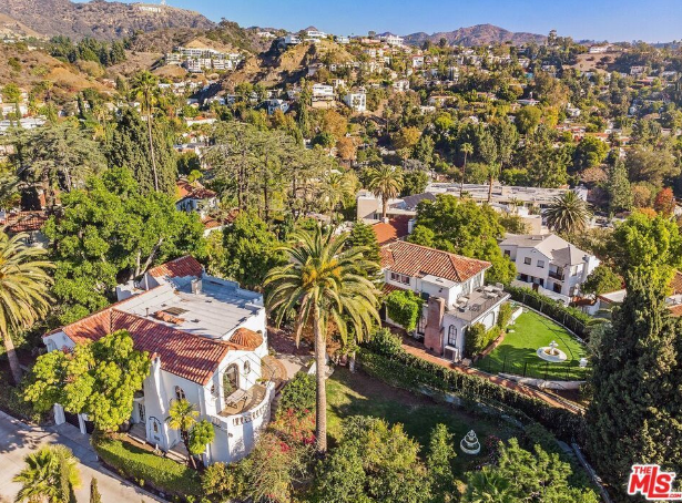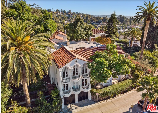 6809 Iris Circle was built in 1926 for widower Mary McNerney by architect W.A. Alexander, both from Huntington Park. The Spanish Villa 8-room home consists of 3,300 square feet with 4 bedrooms and 3 bathrooms and a two-car garage. The residence sits on a double lot and contains a famed Batchelder-tiled fireplace, Juliet balconies and direct access to the house from the garage, which is an usual feature in Whitley Heights (most garages are detached in the area). Below, 6809 Iris Circle is in the center with Whitley Terrace in the front.