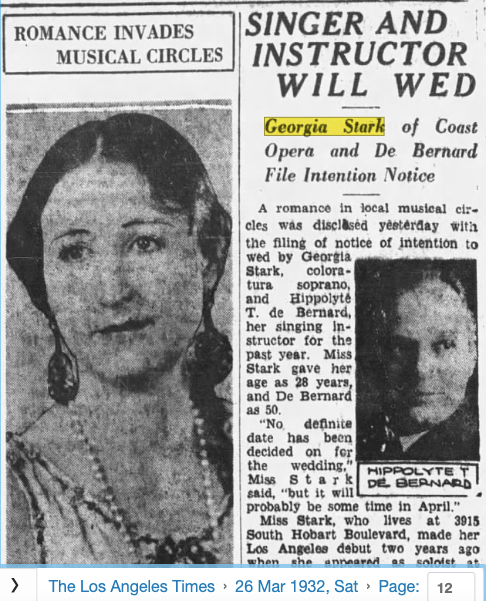 In 1932, she decided to marry her voice teacher, Hippolyte de Bernard. The French born instructor was 50 years old and previously married- she was only 28 and it was her first marriage. The couple also resided at another Whitley Heights residence (demolished for the 101 Freeway in the 1950s) at 6616 Odin Street in 1942. De Bernard died a year later at the age of 61.