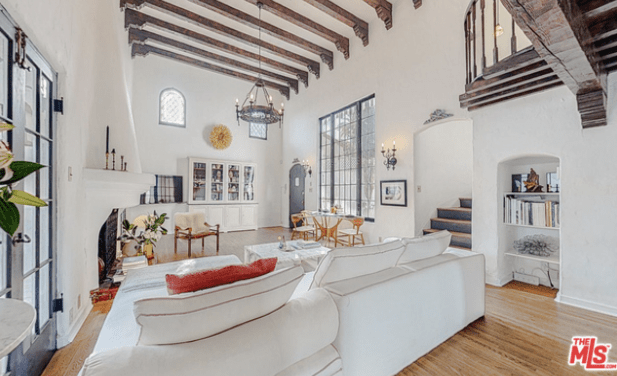 Upon entering the house, there is a formal grand living room with 15 foot high rough-hewn beam ceilings, narrow-plank oak wood floors and a tall picture window. French doors open to a covered veranda.